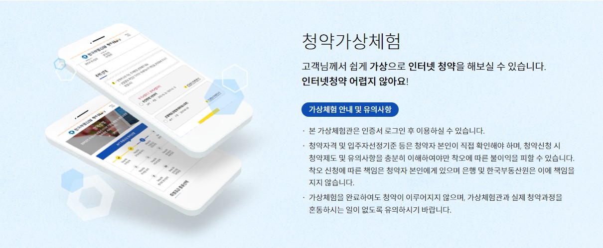 처음 청약 신청을 한다면 낯선 용어로 인해 어렵게 느껴질 수 있습니다. 따라서 기한 내 실수 없이 신청할 수 있도록 청약 Home에서 제공하는 ‘청약가상체험’ 서비스를 활용해 충분한 연습을 해보시기 바랍니다.