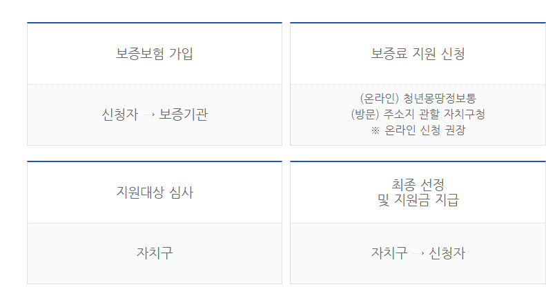 보증료 지원사업에 신청한다고 해서 바로 지원금을 받을 수 있는 것은 아니고, 절차가 존재합니다. 신청자가 보증보험에 가입한 상태에서 보증료지원을 신청합니다. 그러면 자치구에서 지원대상인지 아닌지 여부를 심사합니다. 심사 뒤 대상자로 선정되면 그때, 지원금을 지급합니다.